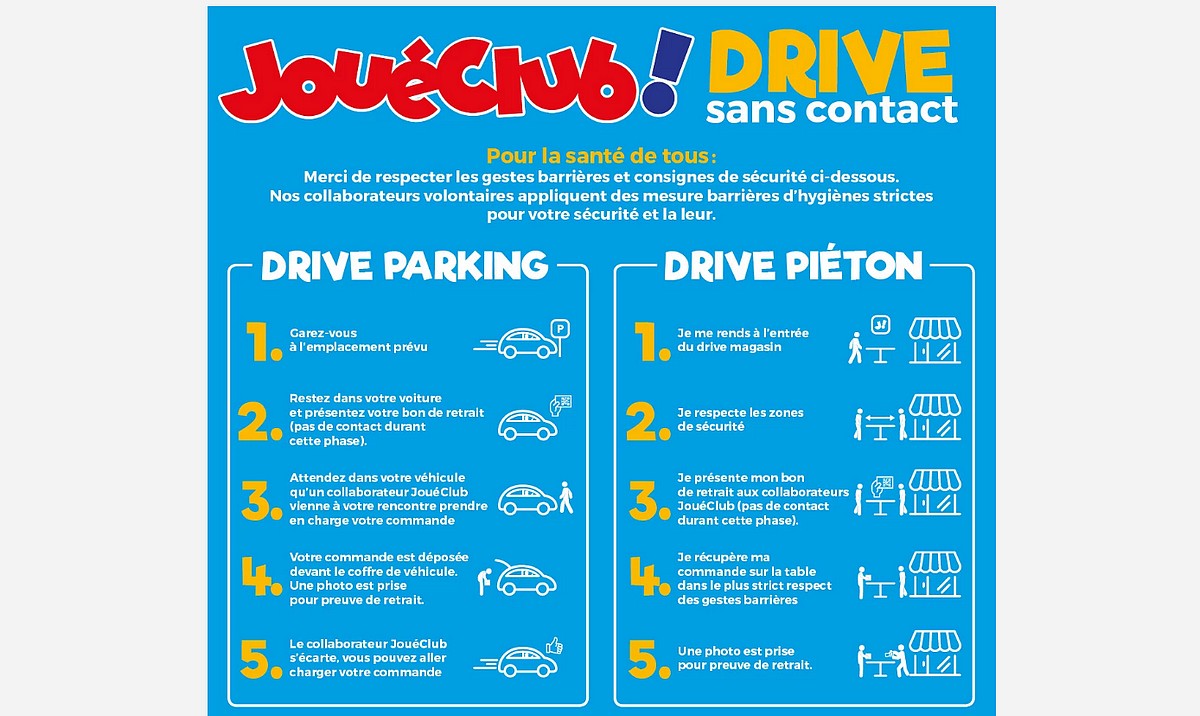 JouéClub réouvre ses Drives piétons et parking FacebookXEmailLinkedIn L’enseigne de jeux et de jouets JouéClub annonce rouvrir ses Drives piétons et parking en respectant les consignes de sécurité sanitaire afin de protéger ses employés et ses clients. Les infos clés sur ce sujet