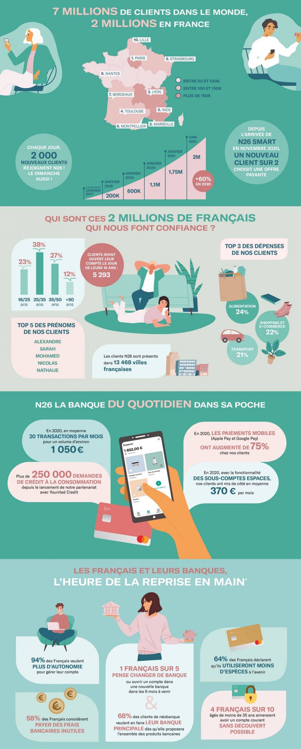 Aujourd’hui, sur les 1 500 salariés de N26, ce sont près de 250 personnes qui sont dédiées au marché français. 2021 marque aussi l’ouverture du bureau parisien avec l’équipe de direction N26 France. N26 se positionne pour donner plus d’autonomie aux Français afin de gérer leur compte sur leur mobile et délivre un compte bancaire actualisé en temps réel ainsi qu’un accès à un service client disponible 7 jours sur 7. Avec la crise de la Covid-19, « le mobile devient le porte-monnaie du quotidien. Les espèces et les agences laissent la place aux applications et aux paiements mobiles » commente Jérémie Rosselli, DG N26 France & BeNeLux.