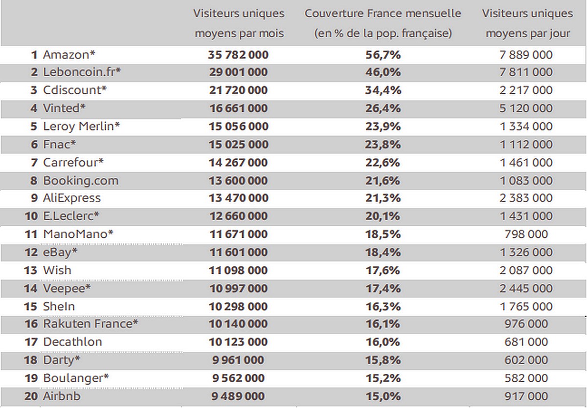 Au 2ème trimestre 2021, en moyenne, 46,8 millions d’internautes, soit 3 Français sur 4 (74%) ont consulté, chaque mois, au moins un des sites ou une des applications du Top 20 des sites e-commerce les plus visités en France. Amazon, leboncoin et CDiscount arrivent en tête du classement. Cette arrivée du leboncoin à la 2ème place des sites les plus visités, s’explique car « leboncoin s’est fortement transformé. Il a lancé des fonctionnalités de paiement et de livraison » commente Martin Berthonneau, Chief Product Officer, au leboncoin, du groupe Adevinta. Ce classement a été établi par Mediamétrie, Netratings et la Fevad.