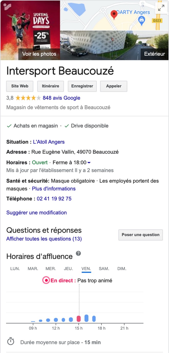 De plus, les actions sur ces fiches, comme les clics sur le site web ou les demandes d’itinéraire, ont augmenté de 58% par rapport à la même période. Les statistiques montrent 2,7 millions de clics sur les fiches « Google My Business » d’Intersport dont 1,1 million de clics vers le site web de l’enseigne et 700 000 demandes d’itinéraires. Il y a eu 100 millions d’affichages, soit le double de l’année précédente.