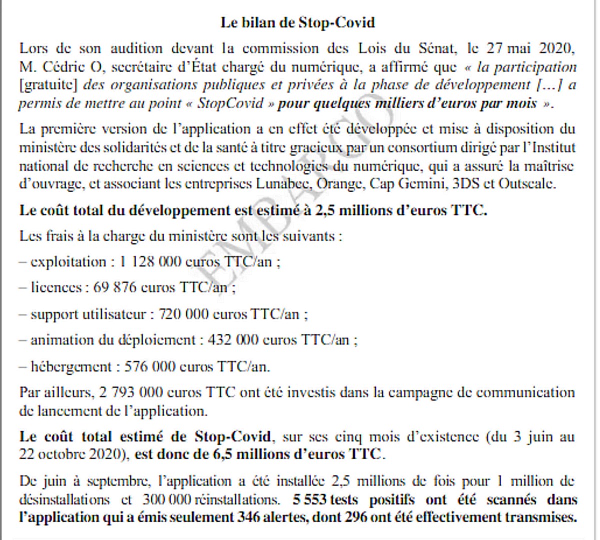 Ces coûts sont extraits du rapport d’une commission d’enquête de l’Assemblée Nationale qui fut publié le 2 décembre 2020 par le JDD. Pour une raison inconnue, Anticor ne cite par toutefois les coûts d’exploitation chiffrés à 1 128 000 € TTC par an par les députés. Au bout du compte, les députés estimaient le coût total de StopCovid, sur cinq mois d’existence, du 3 juin au 22 octobre 2020, à 6,5 millions d’euros TTC. Ils rappellent que la première version de l’application a été développée et mise à disposition du ministère des solidarités et de la santé à titre gracieux par un consortium dirigé par l’Inria qui a assuré la maîtrise d’ouvrage, et associant les entreprises Lunabee, Orange, Cap Gemini, 3DS et Outscale. L’action des développeurs de la startup Lunabee avait été particulièrement saluée par Cédric O.