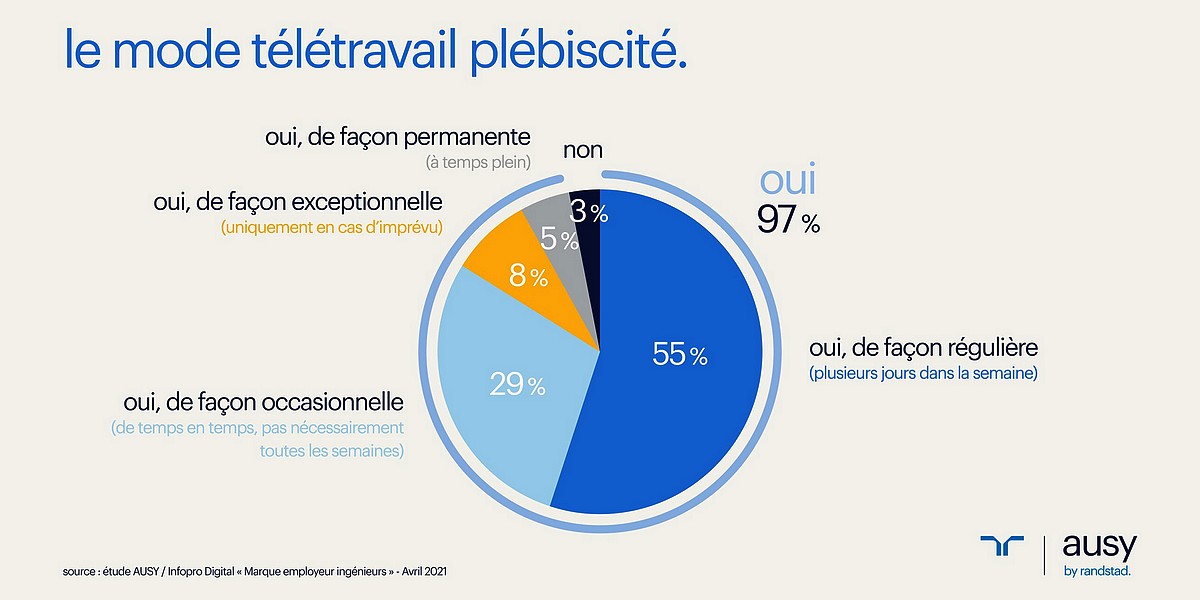 Dans le détail, plus de la moitié des ingénieurs (55%) souhaitent pouvoir télé-travailler de manière régulière, plusieurs jours par semaine. Et 29% pensent avoir recours au télé-travail de manière occasionnelle, de temps en temps et pas forcément toutes les semaines. Un petit pourcentage (5%) veulent 100% de télétravail.