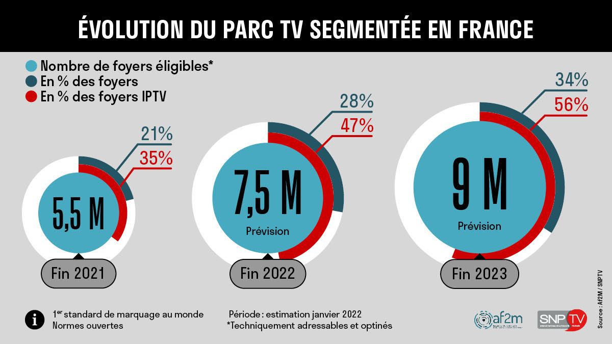 L’Af2m et le SNPTV prévoient qu’à la fin de 2022, il y aura 7,5 millions de foyers éligibles à la TV segmentée, pour atteindre 9 millions de foyers éligibles à la fin 2023.