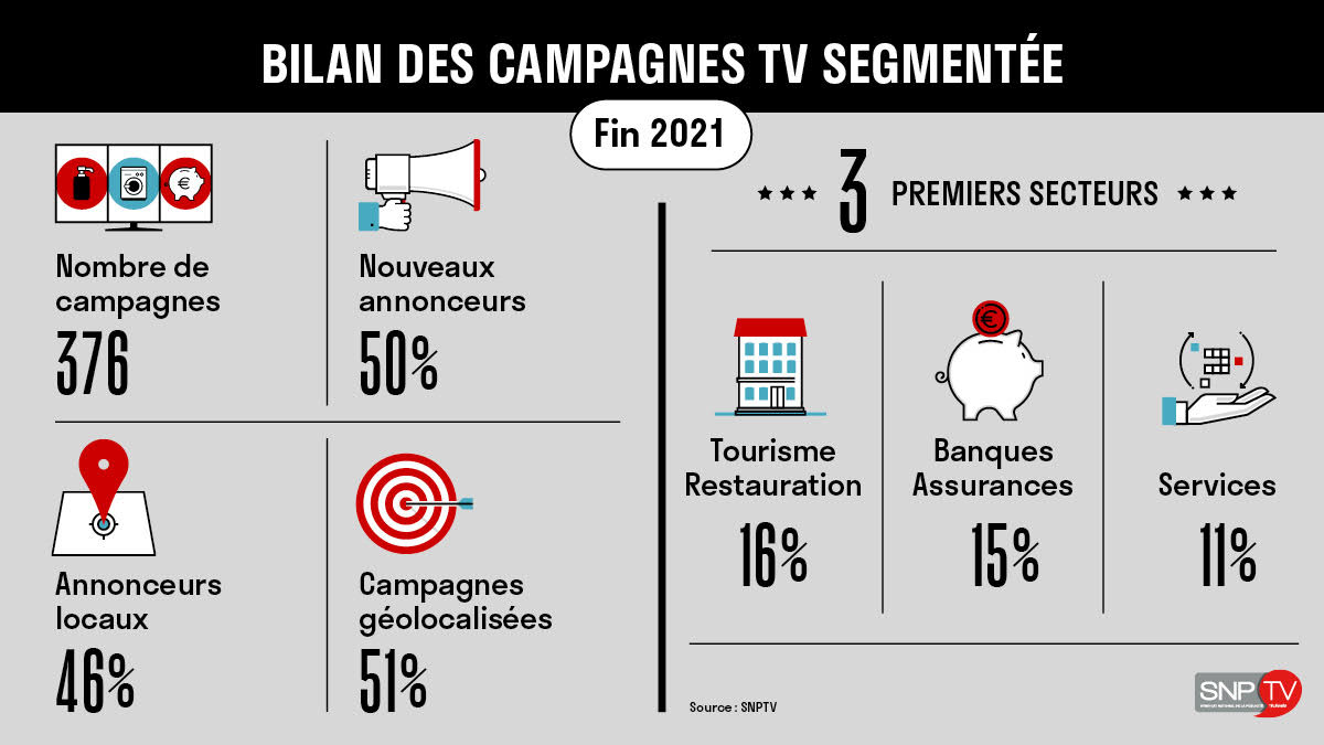 En 2021, les régies membres publicitaires du SNPTV ont diffusé 376 campagnes de TV segmentées dont les 3 premiers secteurs sont le Tourisme/Restauration (16%), les Banques/Assurances (15%) et les Services (11%).