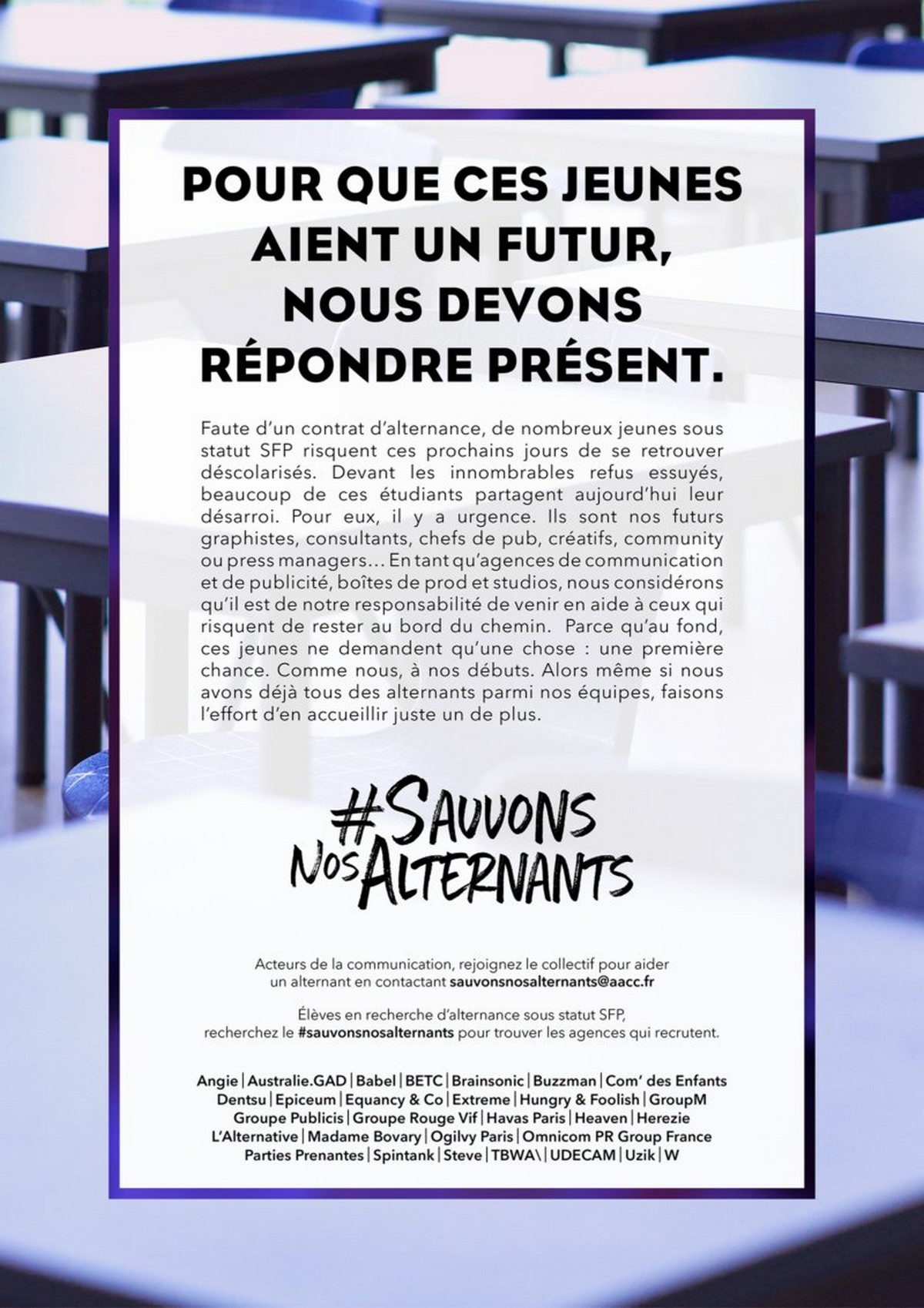 50 agences de communication lancent l’opération #SauvonsNosAlternants pour venir en aide aux élèves en recherche d’alternance selon le mode SFP (Stagiaire de la Formation Professionnelle). Parmi elles : Australie.GAD, Babel, Steve, BETC, Publicis Groupe, Ogilvy Paris, Extreme et Havas Paris.