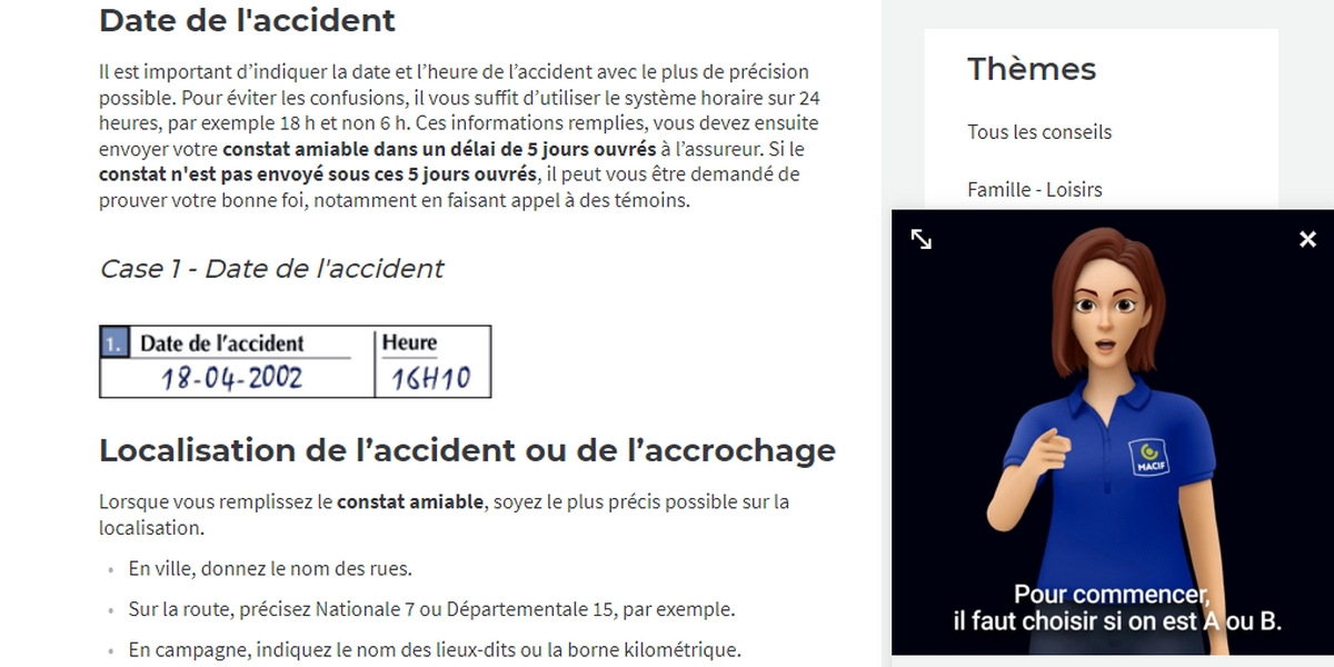 L’assureur Macif aide les personnes sourdes à remplir leur constat amiable grâce à un avatar qui traduit les procédures en langue des signes. Le dispositif est disponible à la fois sur l’application mobile et le site macif.fr (Cliquez dans le carré vert sur la droit indiquant LSF). A partir du constat amiable papier, on lit le QR code afin d’activer l’avatar qui s’exprime en langue des signes.