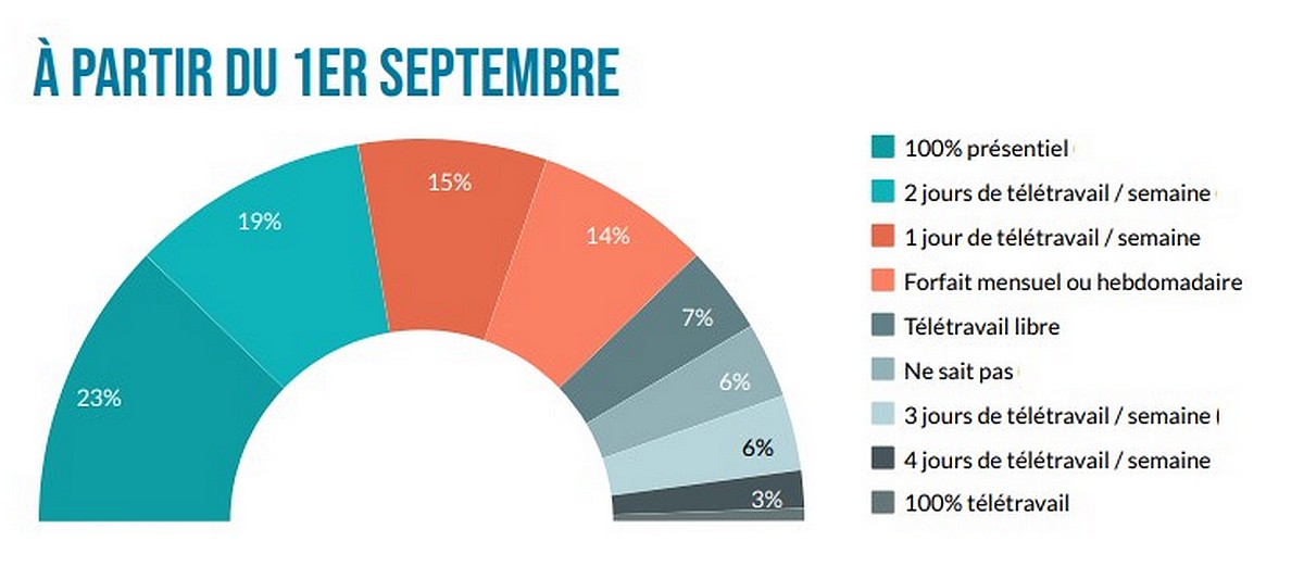 Dans les détails, l’usage du télétravail est prévu 2 jours semaine (19%), 1 jour par semaine (15%), un forfait mensuel ou hebdomadaire (14%), un télétravail libre (7%), 3 jours par semaine (6%), 4 jours par semaine (6%) et uniquement en télétravail (3%).